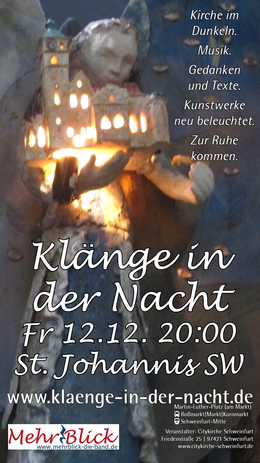 Mitten in der Nacht erwachen in der dunklen Johanniskirche einzelne Figuren zum Leben. Ausschnitte aus Kunstwerken der Johanniskirche werden beleuchtet. Ungewohnte Perspektiven auf die Kunst und auf das eigene Leben entstehen. Literarische Texte verweben sich mit leiser Musik der Band MehrBlick in kleiner Besetzung (Sandy und Klaus Fiedler, Heiko Kuschel)