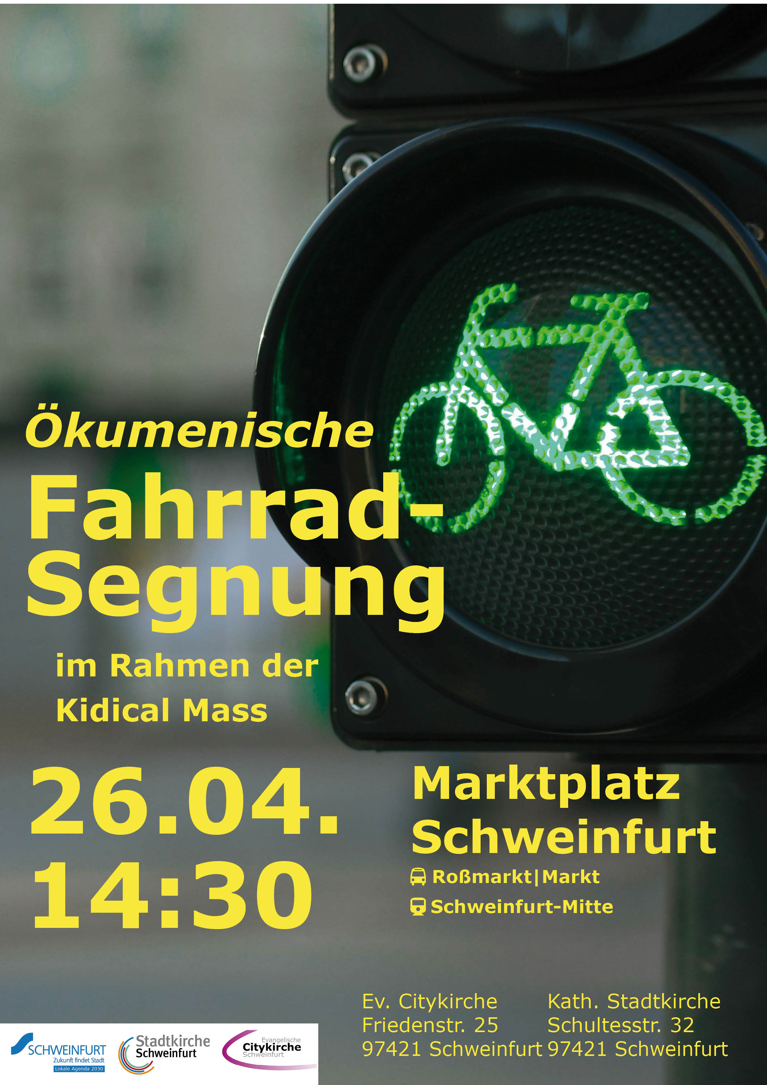 Vor dem Start der "Kidical Mass"-Fahrraddemo durch die Stadt Schweinfurt laden wir ein zu einer kurzen ökumenischen (eventuell auch interreligiösen) Andacht und anschließender Segnung der Fahrradfahrenden auf dem Martkplatz Schweinfurt.