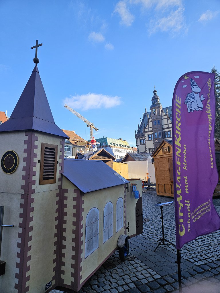 Und auf dem Marktplatz ist geschäftiges Treiben beim Aufbau des Weihnachtsmarktet. Da ist für unsere Kirche ja kaum mehr ein Platz.